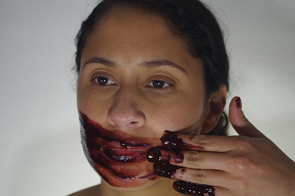 Rito y simulacro indaga y evidencia desde la sangre menstrual, propone una analogía con el uso y práctica de la pintura corporal en algunas comunidades aborígenes en el mundo. Se ritualiza la pintura del rostro como una forma de preparación ante el ciclo y propicia una relación mucho más cercana con este fluido corporal; la acción de manchar el rostro con menstruación es dejar la marca o la huella de lo que somos, expone la naturaleza femenina, el contacto y experimentación con el cuerpo. Carolina Castillo Carvajal